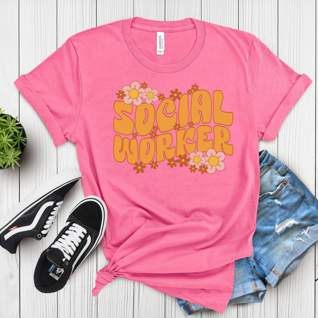 Bright, uplifting, and full of heart — this tee celebrates the beauty and dedication of the social work profession. Featuring Social Worker in playful wavy text surrounded by charming floral accents, it’s a cheerful reminder of the compassion and growth you bring to every day.