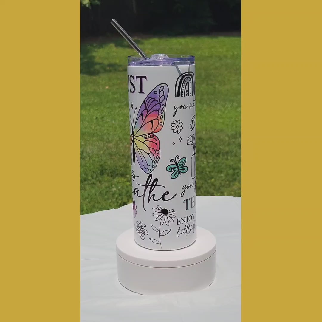 Whether you're powering through a busy day or enjoying a quiet break, the Just Breathe 20oz Stainless Steel Tumbler is your perfect companion. Designed to keep your drinks at the ideal temperature. Hot for up to 6 hours or cold for up to 12. This double-wall insulated tumbler combines sleek durability with a calming message to remind you to pause and reset.